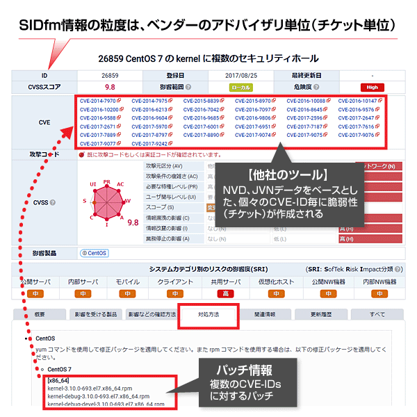 SIDfm の脆弱性データベースや管理ツールを使用すると、「現場SE」のこうした負担をなくします。SIDfm の脆弱性データは、各ソフトウェアベンダーの正式なセキュリティ・アドバザリ情報(=パッチ情報)を「一単位」として作成されています。一般にこうしたパッチは、複数の CVE を纏めて修正する形となっております。脆弱性管理もこの単位で行い、CVE ID 単位ではありません。SIDfm RA や VM といった管理ツール製品では、この単位で「脆弱性チケット」が作成されます。従って、CVE ID ベースの管理アプローチである、修正すべき CVE が含まれている「パッチ」を探すという非合理的な作業は SIDfm では必要ありません。SIDfm は「脆弱性チケット」内から参照できる情報として「パッチ情報」がタイアップされており、チケット内から直接、パッチを参照できます。SIDfm ベースで発行される「チケット」には、当該対象となる CVE ID やパッチの在り処情報、脆弱性の評価指標などが全て纏められて閲覧できるようになっています。