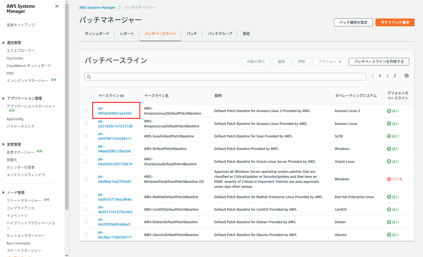 AWS-AmazonLinux2DefaultPatchBaselineのベースライン ID をクリックします。 -