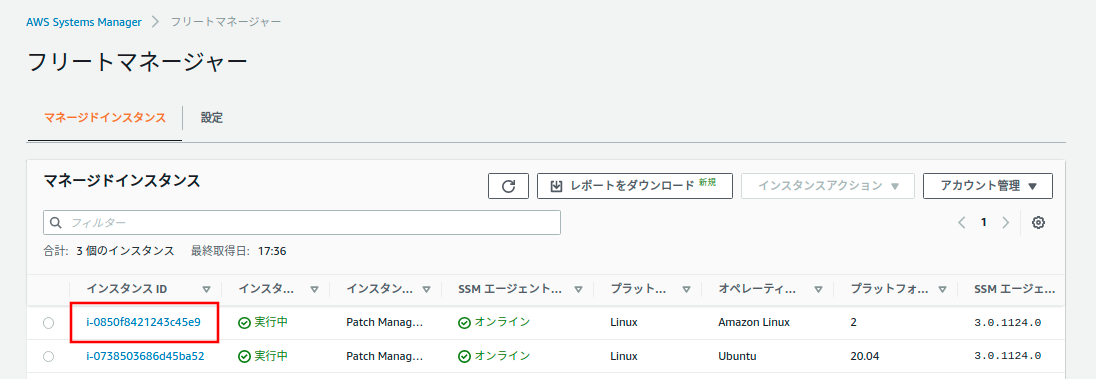 インスタンスをパッチグループに関連付けるため、左メニューから [フリートマネージャー] をクリックします。