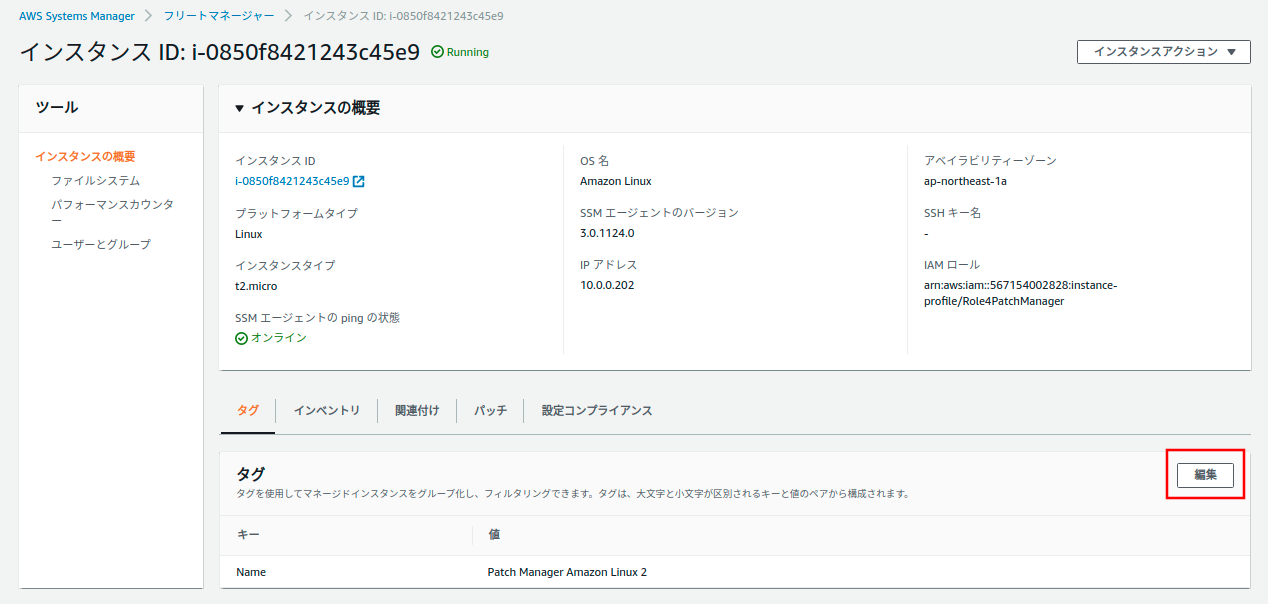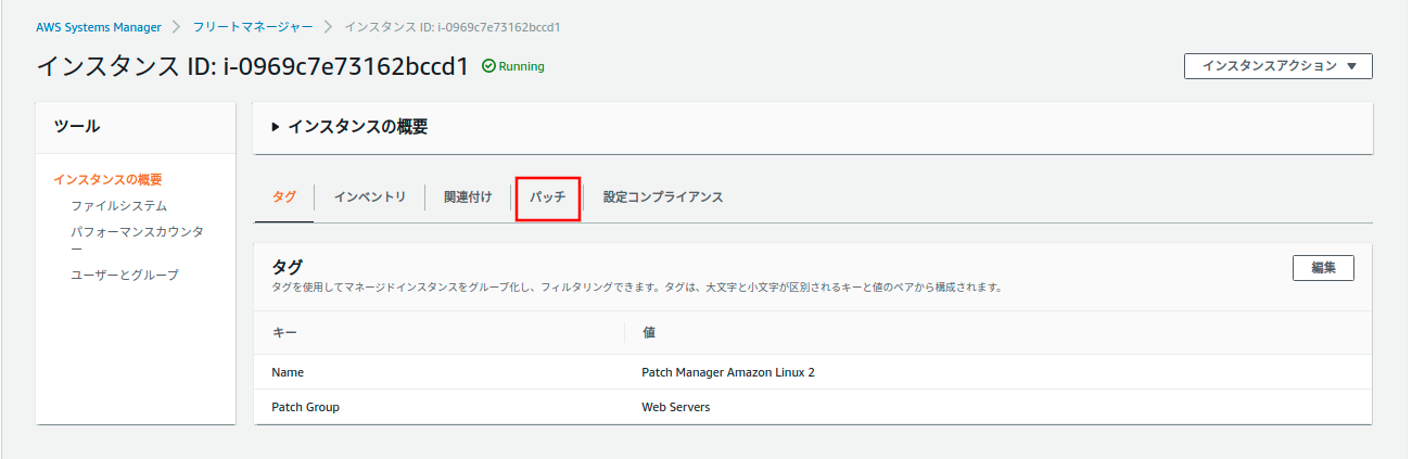パッチグループに関連付けたいインスタンスが複数ある場合は同様の操作を実施してください。 タグの操作は EC2 サービスの画面からも実施可能です。
