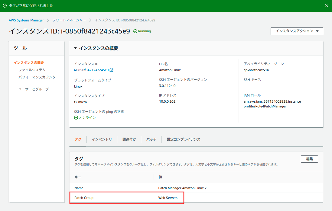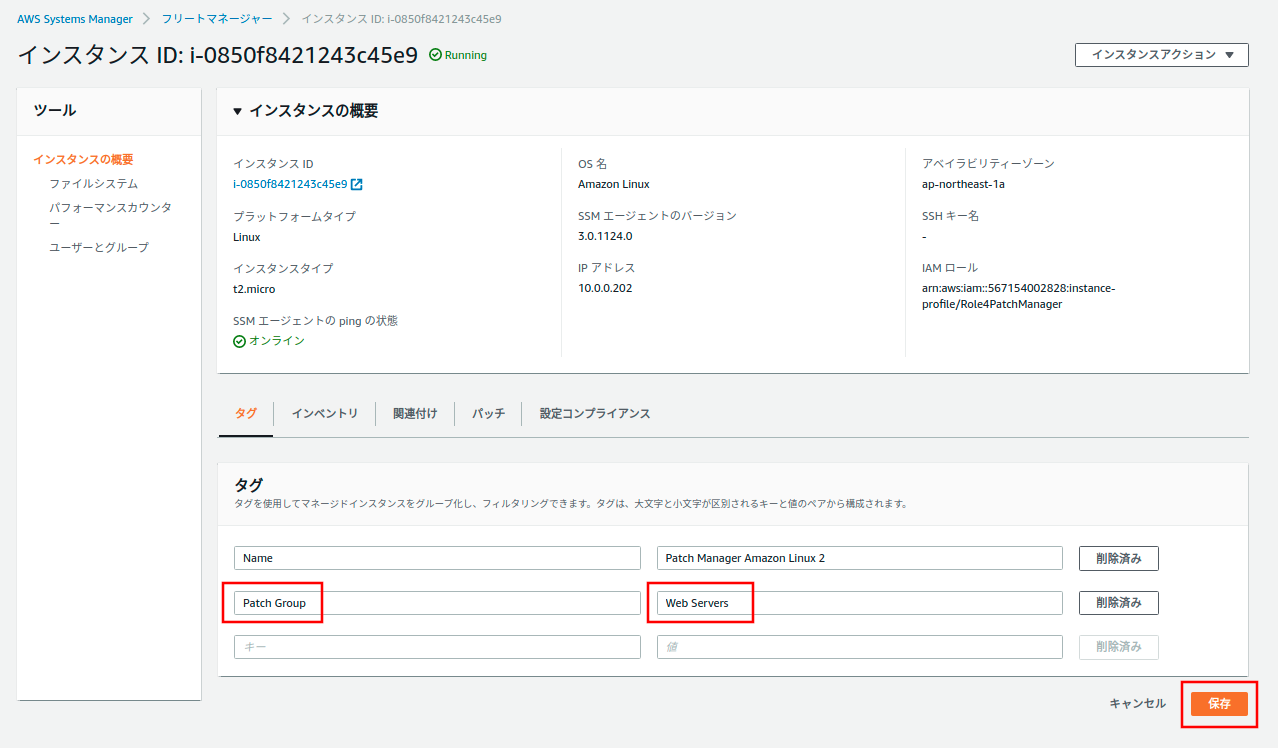 タグを追加します。ここでキーは必ず Patch Group にしてください。 値は先程のパッチグループ名を設定します。タグの入力後、[保存] ボタンをクリックします。