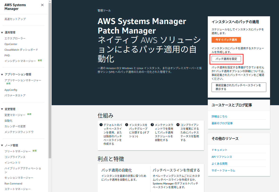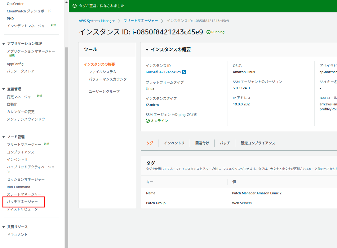 AWS Systems Manager のトップ画面の左メニューから [パッチマネージャー] をクリックします。