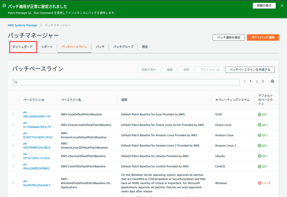 実際の運用では、セキュリティパッチの運用ポリシーを念頭に置いた上で、パッチベースラインを選択または作成することになります。
