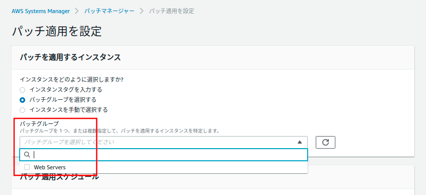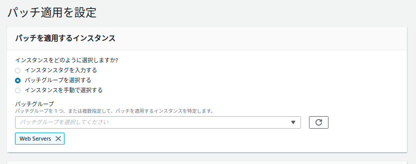 パッチを適用するインスタンス セクションでは、 ラジオボタンから [パッチグループを選択する] を選び、[パッチグループ] 欄でパッチグループを指定します。