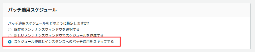 パッチ適用スケジュール セクションでは、処理の実行タイミングや周期を設定します。 今回の処理は即時で実行するため、ラジオボタンから [スケジュール作成とインスタンスへのパッチ適用をスキップする] を選択してください。
