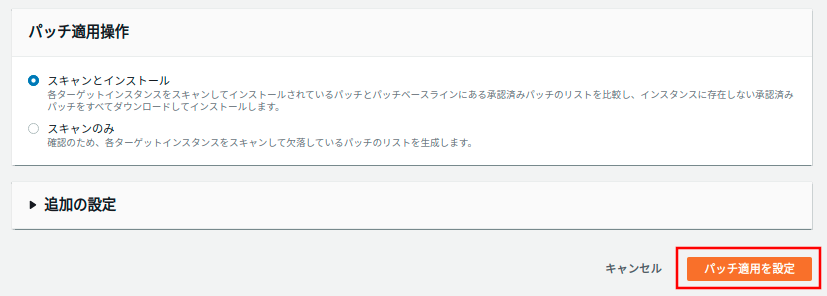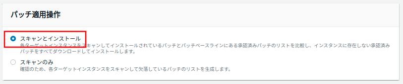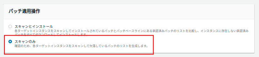 ここでの「スキャン」は、インスタンスにあるパッチベースラインを適用した際に不足しているパッケージを洗い出す処理となります。 「スキャンのみ」ではパッケージのインストールは行われません。