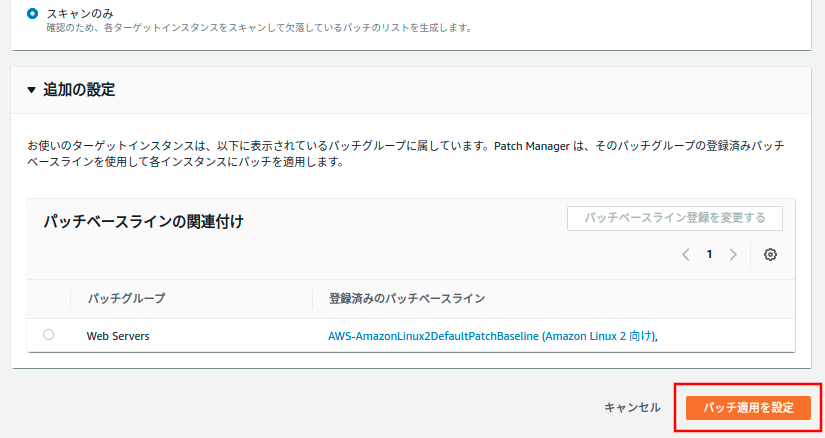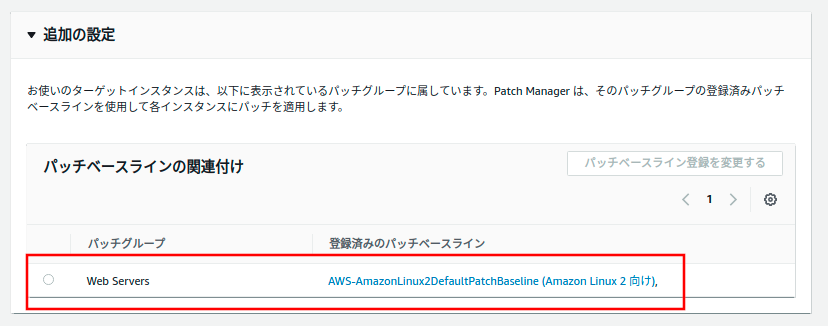 追加の設定 セクションでは、パッチベースラインの関連付けを確認できます。