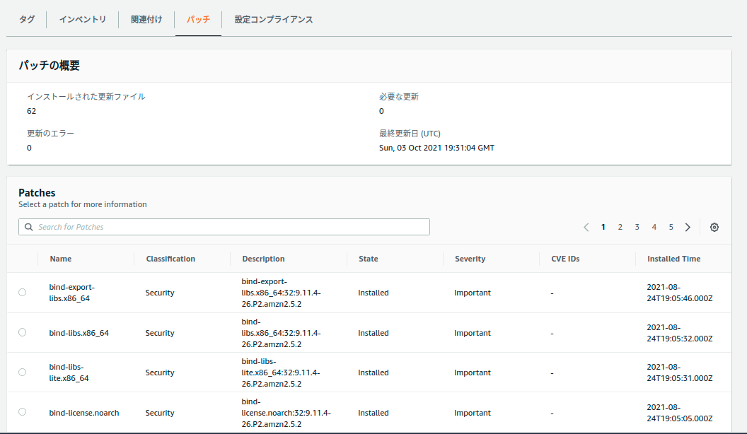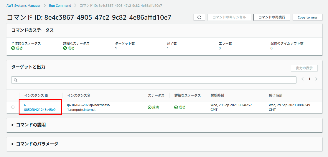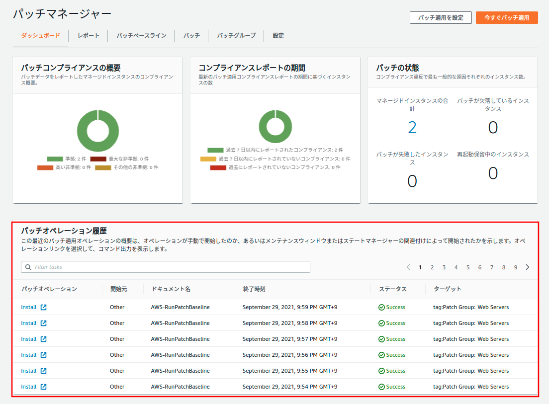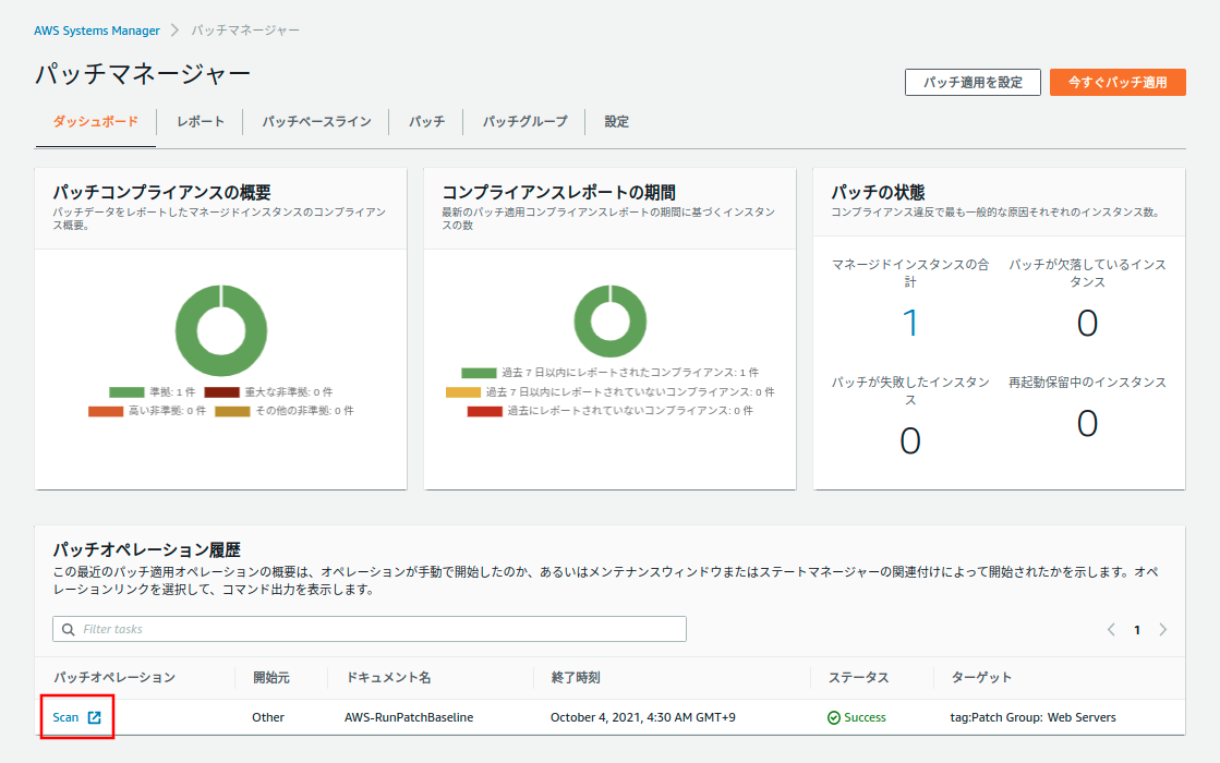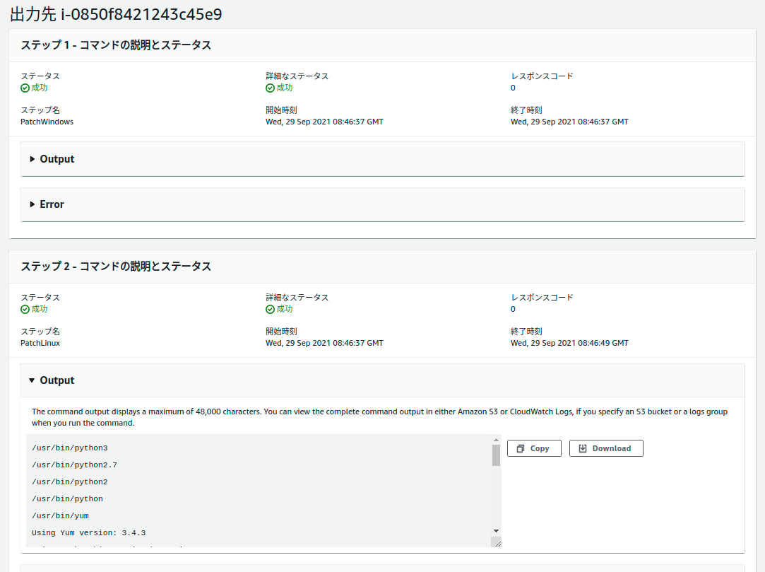 パッチオペレーションのステータスなどを確認できます。 ターゲットと出力 セクションの各インスタンスへのリンクを辿ることで、インスタンスでの処理状況の確認も可能です。