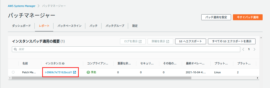 [レポート] タブを参照することでパッチ適用の概要を確認できます。 インスタンス単位の状態を確認するにはインスタンス ID のリンクをクリックします。