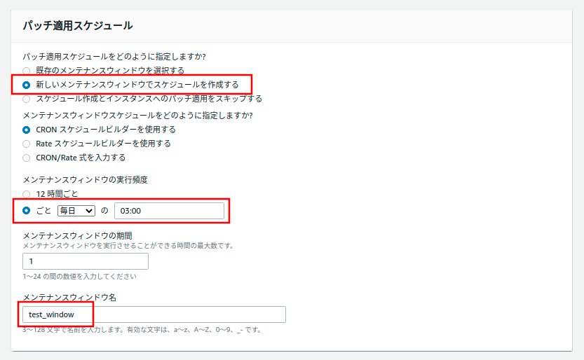 パッチ適用スケジュール セクションでは、 ラジオボタンから [新しいメンテナンスウィンドウでスケジュールを作成する] を選びます。