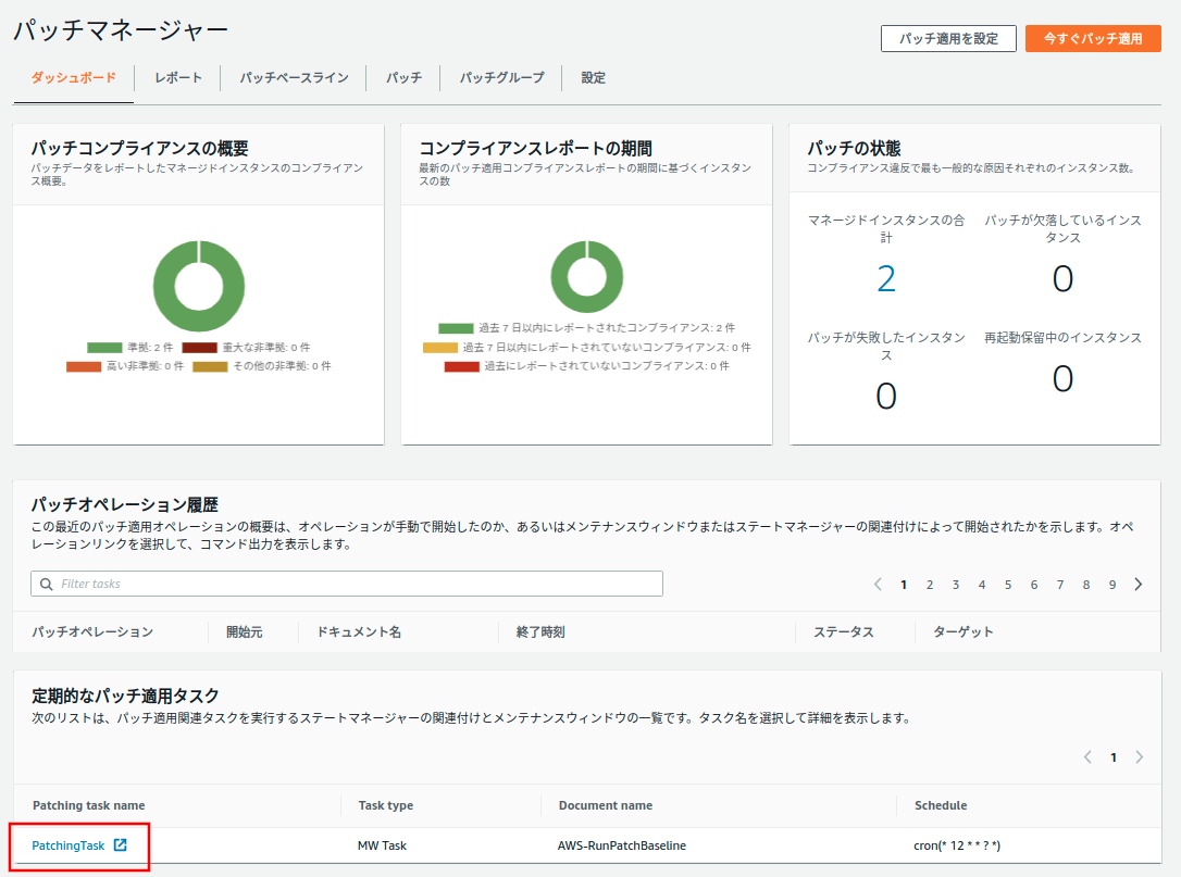 定期的なパッチ適用タスク セクションに、先程設定したタスクが追加されます。 詳細を確認するため [PatchingTask] リンクをクリックします。