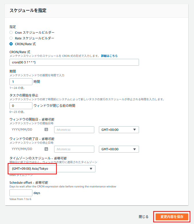 スケジュールを指定 セクションの [タイムゾーンのスケジュール - 省略可能] ドロップボックスで [(GMT+09:00) Asia/Tokyo] を選択します。 その後 [変更内容を保存] ボタンをクリックします。